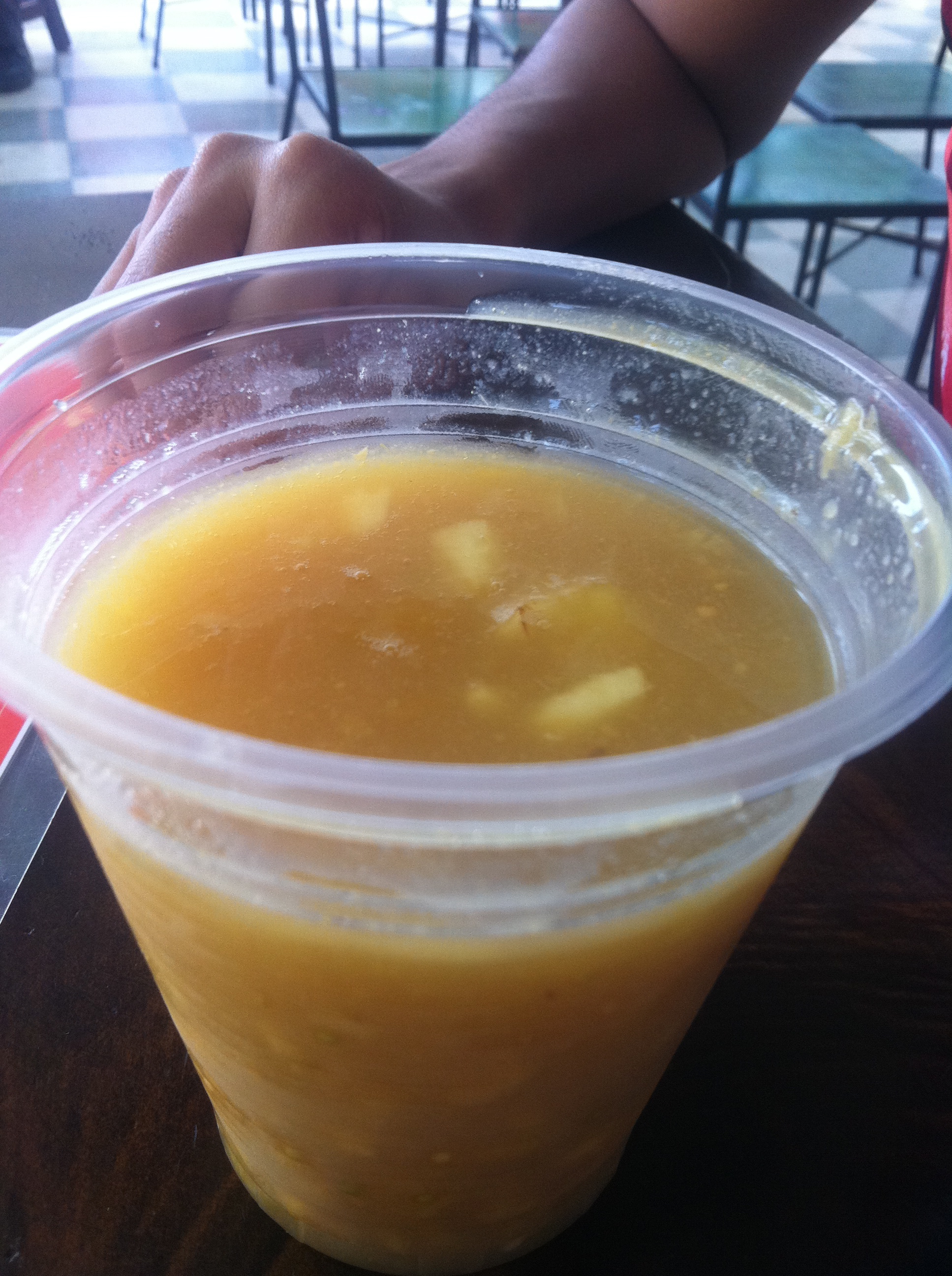 A “drink” I had never heard of before made of a fermented mixture of fruits and corn and seasoned with cloves and cinamon. This is sold by the glass from huge vats carted around the street on special bicycles. It may look a little like vomit (just like salpicon and mazamora) but it is delicious.